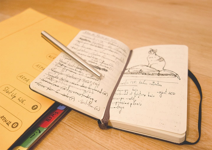 Plus importants que jamais dans mon organisation, ce ne sont toutefois plus tout à fait les mêmes. Le Moleskine au format portrait à couverture souple a été remplacé par un Moleskine de gamme supérieure à couverture rigide. Il me sert de « mémoire secondaire » avec mon agenda. Étant donné que je suis amené à penser à énormément de choses et que j’ai de nombreuses idées, je les consigne alors dans ce carnet. Non pas que j’envisage de toutes les réaliser, mais ainsi elles ne me parasitent plus. Ce carnet me sert aussi à dessiner en de rares occasions et fait également office de portefeuille.